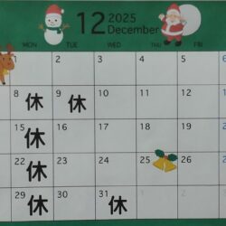 2025年11月18日 / 最終更新日 : 2025年11月18日 totonoetai お店のこと 12月営業カレンダー Xmas、年末年始とイベントの時期になりますね。自分への1年頑張ったご褒美に施術でメンテナンスして余裕ある状態で1年を締めくくりましょう!